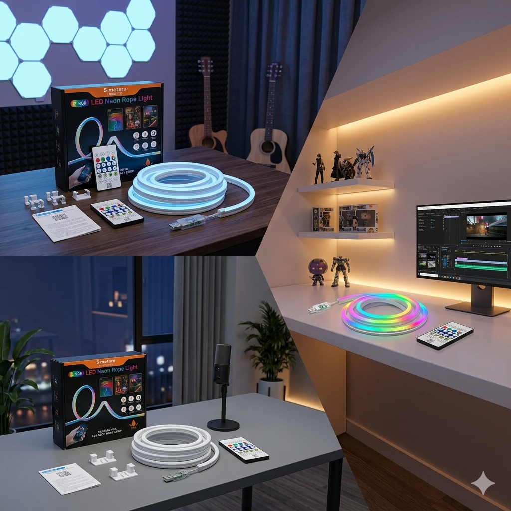 আপনার ঘর বা গেমিং সেটআপকে প্রিমিয়াম লুক দিতে এই 5 Meter LED Neon Rope Light একদম পারফেক্ট। এতে আছে উন্নত মানের IC-RGB প্রযুক্তি, যা সাধারণ স্ট্রিপ লাইটের তুলনায় অনেক বেশি স্মুথ এবং মাল্টিকালার ইফেক্ট প্রদান করে। এটি ফ্লেক্সিবল হওয়ায় যেকোনো শেপে বাঁকানো যায় এবং রিমোট বা মোবাইল অ্যাপ দিয়ে সহজেই কন্ট্রোল করা সম্ভব।
